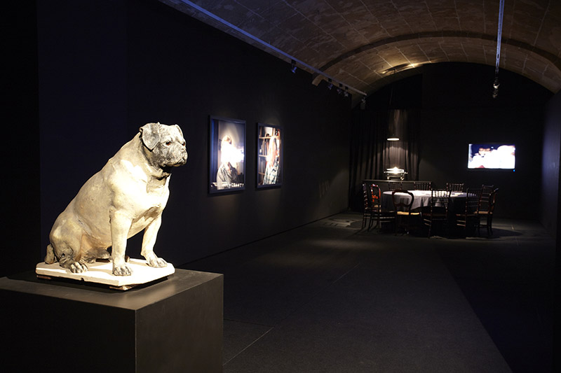 Aquí comienza la dialéctica, la ambigüedad y la relación de contrarios. La sala del Casal Solleric alberga, también, un retrato fotográfico de Vidal junto a su perro, un carlino que responde al nombre de Vostell en honor al conocidísimo artista fluxus de origen alemán. Una pieza con la que el creador vuelve a jugar con los conceptos de autoría en el arte contemporáneo al encargarle su «autorretrato con perro» al fotógrafo antes mencionado que actúa de ejecutante creativo de las ideas de Vidal. Esta imagen comparece acompañada de tres objetos elevados a la categoría de pieza artística por el propio creador: una talla anónima del siglo XIX realizada en madera y que representa a un ejemplar de esa misma raza -una pieza de artesanía que hace de “objeto encontrado por el arte contemporáneo”-, el propio collar de su perrocon las letras de su nombre realizadas en cristal de joyería y, completando la composición, la cartilla de identificación del carlino enmarcada.