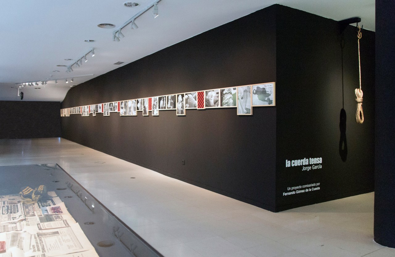 “La cuerda en espera” (2019) quizás sea la pieza más icónica de esta exposición. Una escultura que representa, en bronce, aquella soga que su abuelo y su padre dejaron colgando del techo de la nave donde trabajaban, una cuerda que actúa a la manera de un nuevo monumento y que espera ser tensada por Sísifo para subir las cargas más pesadas, para soportar los trabajos más estériles, pero también para sujetar a quien pierde el equilibrio o, en sentido contrario, para robar el último aliento del suicida desesperado, porque como señala la intervención mural que incardina la muestra y que se convierte en toda una declaración de principios: “Las agonías largas hacen perder las formas” (2019). Alguno de esos seres sumidos en la desesperanza son los que Jorge García, junto a su colaboradora Amanda Lago, llevan tiempo grabando con su móvil en la serie titulada “Ruidos de fondo” (2019) donde ambos van elaborando un bestiario del agotamiento, de la frustración y de la alienación a la que nos ha sometido este mundo depravado y obsceno, un catálogo visual de todos aquellos que se mueven bajo la superficie de la normalidad y de la rutina, quedando prácticamente ocultos bajo el manto opaco de la vorágine contemporánea y que, en algún momento, pueden decidir acabar con ese sufrimiento. Como el arcano colgado de la soga, como un moderno Prometeo condenado a que las alimañas devoren sus vísceras, el artista padece una herida mortal que sólo es sanada, en parte, por este acto heroico de lucha y de resistencia que culmina cada vez que produce y comparte alguna de sus piezas, aquellas que lo curan, pero que también preparan sus entrañas para el festín nocturno de las aves carroñeras: “Get Your Guts Ready”.