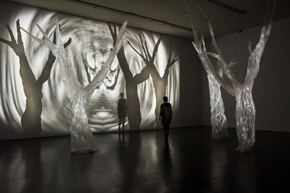 Entrando de nuevo en el bosque, las obras de Amparo Sard para esta tercera sala se han vuelto luminosamente oscuras. Esa búsqueda de la luz tenue con la que la artista trabaja y que señala el conocimiento en medio de la negritud[10], también sirve para explicarnos que, aunque no son siempre visibles, la sabiduría, la belleza y lo siniestro pueden estar en cualquier lado. La gran instalación de polietileno titulada “Paisaje desubicado” (2016) [sala 3] irrumpe en el espacio rompiendo las paredes, una pieza formada por dos enormes árboles que, con su materia y sus sombras, parecen ocupar toda la sala, mientras provocan que el espectador entre de lleno en el estado de ánimo necesario para asimilar el resto del recorrido expositivo. Tanto los “Claros del bosque” de María Zambrano[11] como la Lichtung heideggeriana[12], son metáforas de ese pensamiento que trata de dejar al descubierto lo que está escondido en la oscuridad, una modalidad de conocimiento que es propia de la “revelación”, de una sabiduría que no se puede inducir y cuya obtención no es metódica, que nos sorprende con “iluminaciones imprevisibles” que no se obtienen buscando, pero para las que, sin duda, podemos prepararnos, estar alerta, predispuestos y sensibilizados. Esa es la base sobre la que opera esta instalación que nos habilita para un recorrido donde la conciencia y el inconsciente, lo cierto, lo verosímil, lo irreal y lo falso se van alternando para que el público entre en un auténtica espiral de emociones simbióticas y encontradas, en un camino de introspección e iluminación.