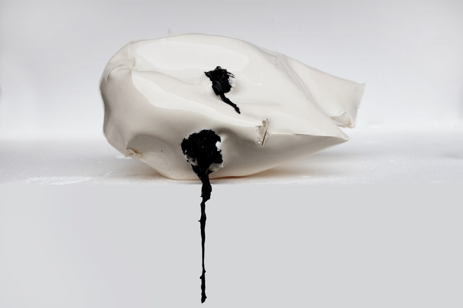 De todas maneras esto apenas es el principio. Amparo Sard busca lo sensorial, pero no solo en las nuevas tecnologías sino también en la materia. Es decir, no solo ir al encuentro de lo siniestro en esa confusión entre la realidad y la ficción que te aporta la imagen en movimiento, o en la exageración del collage expandido, sino también en la confusión entre el propio objeto y el ser vivo[7]. Es por este motivo que la artista tuvo que emprender una investigación sobre nuevos materiales que pudieran superar lo realizado hasta ahora, un factor de innovación y de búsqueda que hace único el presente proyecto. Tomando como base la resina epoxi, una sustancia que permite extender y amplificar todos aquellos recursos que ya se intuyen en la serie “Realidad / Real”, consigue que los orificios que efectúa dejen de ser los responsables de las líneas de un dibujo, para ser auténticas trepanaciones que conectan la parte trasera del cuadro con su diseño frontal y visible, logrando que supure por ellos esa materia “casi viva” que busca la confusión entre lo real y la ficción, entre el objeto y el ser; una relación que, desde la mirada, nos comunica con lo siniestro y con su lenguaje. En algunas de aquellas series de blancos sobre papel sutilmente perforado ya había comenzado a comparecer una capa negra de caucho espeso, opaca, tan plasmática como la que fluye en el mencionado video “Hauptpunkt”, una masa dúctil, maleable, mutante y polimorfa que convierte al hombre y al paisaje sobre el que se extiende en seres y en lugares mucho más pesados, en sujetos, objetos y contextos que cargan con la materia que se les incorpora, con los miedos, las dudas, los problemas y las imperfecciones, con todos esos lastres que van dejando sobre nuestros hombros el exceso y la injusticia permanente e incontrolable en los que se halla sumida nuestra contemporaneidad[8].