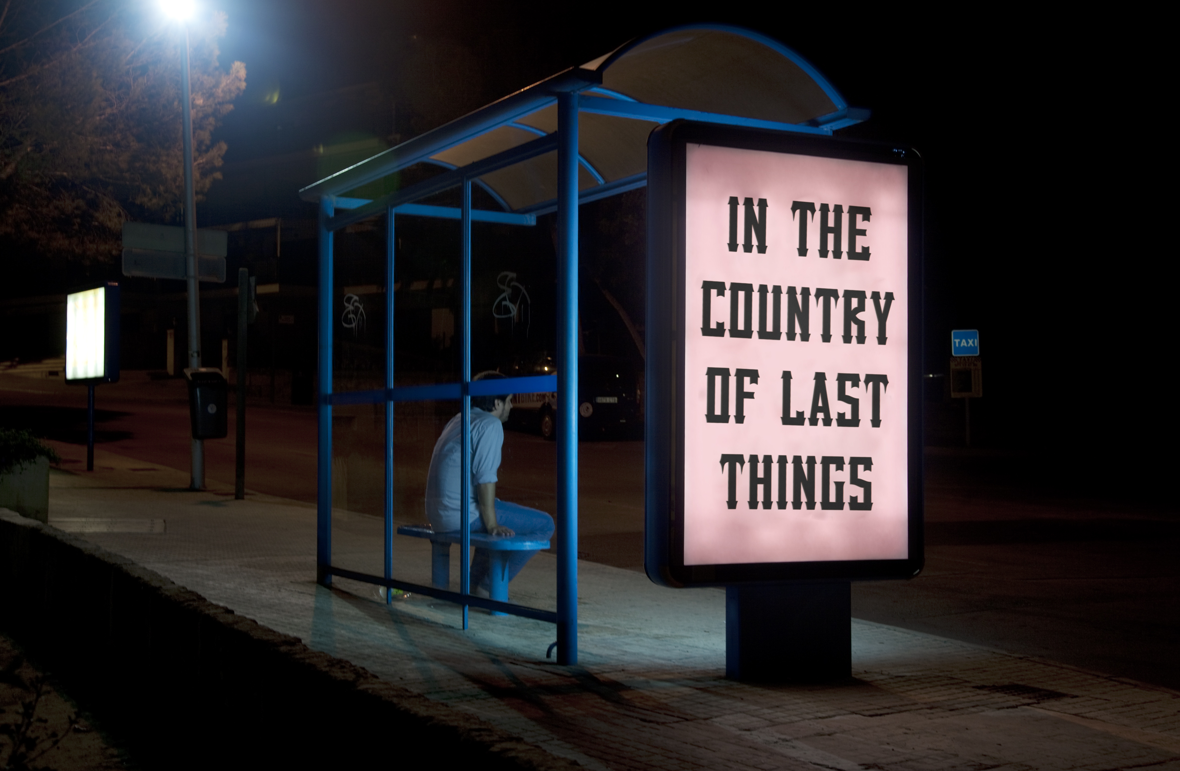 La mencionada exposición “Amanacer dorado” surgió como una propuesta que comunica todas estas líneas de creación, un proyecto que aglutina diferentes series y que toma su nombre de la reacción fascista, neonazi y xenófoba que, hace apenas unos años, rebrotó en Grecia aprovechando la fragilidad, la fractura, los odios y los miedos que afloran cuando la presión es insuperable, cuando la crisis se lo lleva casi todo por delante, una solución criminal, violenta y demagógica, a la que Sala recurre como denominación de una propuesta que deja en evidencia muchas de las incoherencias en las que sigue incurriendo nuestra sociedad. La quiebra de la utopía es una realidad flagrante y Avelino Sala la explicita de una manera muy concreta en sus series de fotografías intervenidas, imágenes paradisíacas sobre las que inscribe el título de novelas distópicas, generando esa contradicción que pone de manifiesto el momento en el que nos encontramos. Efectivamente, en “Amanecer dorado”, las series “Pay Attention Please” (2014), su pieza “Foreigners Club” (2014) o, ya en el campo de la escultura, “Tiempos nuevos, tiempos salvajes” (2014) en la que talla el título de las citadas novelas sobre unos sticks de hockey, así como su reciente participación en el certamen de intervenciones urbanas BetArt (Calvià, Mallorca) con la propuesta “Dist_opis” (2014) donde, aprovechando los dispositivos publicitarios de cartelería luminosa, edita una serie de pósters enigmáticos que, de nuevo, recogen los títulos de estas novelas, configuran un escenario de proyectos que generan una comparación entre la sociedad actual y el texto de ficción al que se refieren, unos escritos donde el control y la perdida de derechos es manifiesto, pero en los que, la libertad bien gestionada, suele acabar triunfando. Una serie de obras que nos llaman la atención sobre los errores cometidos para que tratemos de reflexionar si existen otras opciones, planteándonos que nuestra fuerza reside, individuo a individuo, en el propio colectivo[5].