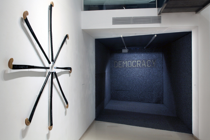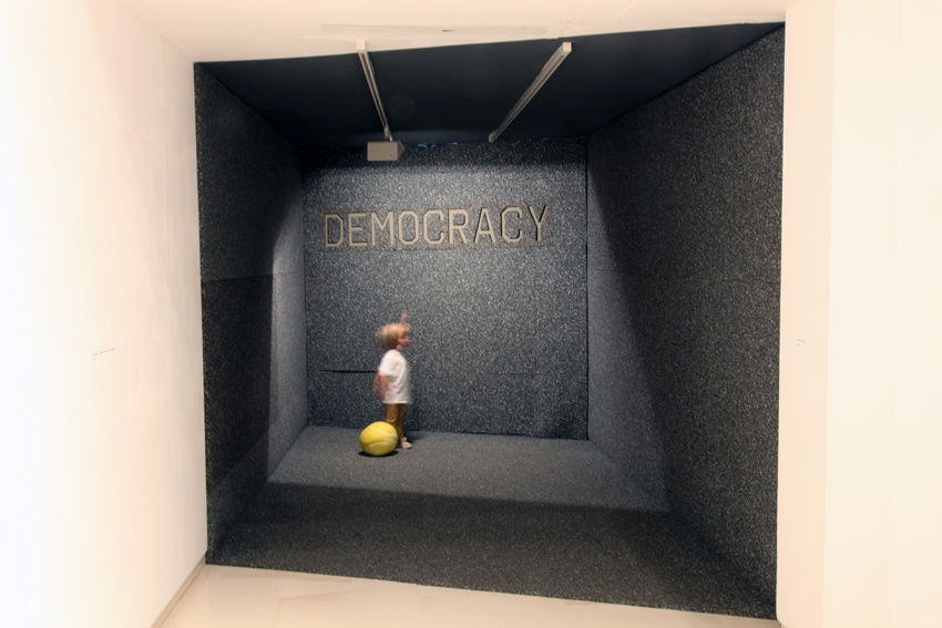 El artista consecuente es plenamente consciente del punto crítico en el que andamos sumidos, un continuo ir y venir entre las expectativas de la utopía y el flagrante choque de la distopía, un momento de ruptura de ciclo económico donde se usa todo tipo de terrorismo como instrumento de coacción, una época de injusticia social y de anulación de las formas de pensar que difieren del dogma globalizado y globalizador. La pieza de Avelino Sala titulada “Democracy” (2014) es un claro ejemplo de ello, una obra que señala un sistema puesto en cuarentena, un cuestionamiento absoluto de su realidad y de su eficiencia. La propuesta tiene diferentes formalizaciones que se ajustan al espacio donde se ubica: una versión bidimensional, la que podemos ver en la presente muestra titulada “Lo (hiper)real absoluto” (Espai Rambleta, Valencia, 2014) donde la pared se cubre de un material que absorbe el sonido y sobre el que aparece troquelada la propia palabra que le da título; y otra, la de la reciente exposición “Amanecer dorado” (Pelaires Projects, Palma, 2014), en la que comparece como una sala cerrada, oscura y también insonorizada, donde una tenue luz puntual dirige nuestra mirada hacia el interior del cubículo en el que se halla esa misma palabra troquelada. Un inútil muro de las lamentaciones que apaga nuestro grito o una habitación del pánico donde desahogarnos sin resultado, en todo caso una sencilla y demoledora metáfora sobre un concepto que se vacía de contenido constantemente, del que casi no queda nada, un trabajo que parte de la inteligencia, la sensibilidad y la ironía para ofrecernos otra visión, la no usual, aquella que decide darle la vuelta a las cosas, aquella mirada intersticial que se instala en la grieta, que se cuela por los resquicios de la pétrea estructura del poder con la intención de cuestionarla y, si le dejan, desbastarla y demolerla.