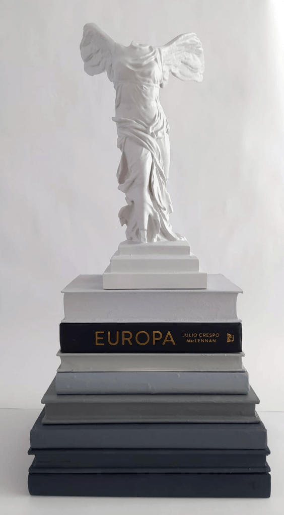 Acto III – La fuga: maniobras de escapismo. Entonces llega el momento de escabullirse, de saltar, de desaparecer para volver a transformarse. En “Plan de fuga” (2017), las banderas entrelazadas de la Unión Europea, anudadas como las sábanas de los presos que pretenden escapar de su celda, parten del mástil para marcar la huida, la vía para la evasión, para la deserción de todas esas superestructuras políticas que, al final, no han servido para nada. El desmantelamiento de las instituciones es un efecto evidente de la crisis en la que andamos sumidos, del agotamiento de las ideologías, del descreimiento y de la alienación del ser humano. Este singular plan para una fuga se completa con tres piezas icónicas que acaban de dar forma a esta demoledora descripción de la distopía: “Europa ha muerto” (2017), un escudo antidisturbios pintado con la bandera de la Unión Europea, “UE as a Hammer” (2020), un martillo cuya empuñadura reproduce el mismo emblema y “Europa vs Victoria de Samotracia” (2020) donde la (es)cultura clásica, desde la ruina del arte herido, se erige sobre algunos de aquellos libros que han incardinado el desarrollo político, social y cultural de occidente, pero que el imparable devenir ha terminado convirtiendo en papel mojado, en palabras sin apenas sentido. La última serie que da forma a este proyecto se titula “Salto al vacío” (2020) y es el inicio de una investigación más extensa que ubica su análisis en ese instante preciso en el que las decisiones se toman, en aquel punto de inflexión que viene justo después de la debacle, en el contexto complejo en el que ahora nos hallamos: una situación de incertidumbre total, de cambio de paradigma. “Salto al vacío” es un estudio sobre la duda, sobre los miedos, sobre la ilusión y sobre ese arrojo que nos lleva a realizar actos irreversibles y apasionados. Una bella metáfora que parte de un protagonista cualificado, de un perfil muy conocido por Avelino Sala, de la figura del artista, del creador y de sus saltos a ciegas, al abismo. Un impulso hacia lo inexplorado que, a pesar de la altura, a pesar del riesgo, no es un suicidio sino una acción consciente, peligrosa, entusiasta e incierta, un acto voluntario y valiente que implica ir hacia delante, hacia ese lugar que queremos, que amamos, que deseamos, pero que desconocemos.