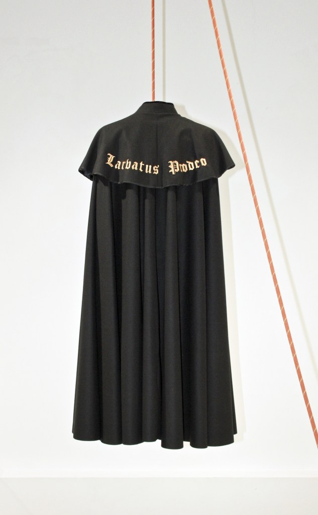 Acto II – Ocultación: el oscuro avance. Avelino Sala (como el filósofo enmascarado) transita camuflado con la voluntad de introducirse y detonar lo establecido, de activar el cambio desde la demolición de lo inútil, remarcando lo perverso y lo estúpido de una estructura sociopolítica y económica que, en lugar de habilitarnos, nos oprime y nos corrompe. “Larvatus prodeo” (2014) reproduce en su título la famosa frase de Descartes. Una capa tradicional española que cuelga de una soga como una marioneta, como un ajusticiado, como un suicida, una vestimenta que contiene en su espalda, con la distinción que le otorga el bordado en letras doradas, esa cita que demuestra el convencimiento del filósofo sobre su método de conocimiento. El propio montaje de la pieza nos pone en relación con lo explícito y con lo oculto, con la apariencia falsa de las conductas poco claras, con una vestimenta clásica que sirve para la ocultación y para el crimen, pero que también se asocia a un signo de distinción, de linaje. Una dualidad que siempre ha caracterizado esa doble moral tan presente en toda la historia de España. En la serie “(R)evolución del sombrero Panamá” (2014) se da una dialéctica similar: partiendo de esa conocida prenda, aquella que la mano de obra ecuatoriana usó durante la construcción del canal del mismo nombre, el artista inicia una deriva que le lleva a convertirla en un nuevo icono de la lucha obrera. No queda otra, la asimilación de este tipo de atuendo, de claro origen proletario, por la aristocracia y el poder, incita a Sala a transmutarlo en una suerte de pasamontañas revolucionario, a convertirlo en un (no tan) nuevo símbolo de la lucha y de la resistencia. Por último, “Censored” (2019), es parte de un proyecto extenso que procura el desvelamiento apelando a la pintura y a la pintada, enfrentándose a la facción material de la represión, a la más notoria, a la de los atributos flagrantes de un poder que se ejerce desde las fuerzas del orden al servicio de la violencia institucional, de los escudos antidisturbios, de las pelotas de goma, de los uniformes, de los cascos y de las porras. Una coacción que oculta las otras armas, los otros resortes a los que se enfrenta el artista, mucho más profundos, mucho más peligrosos, que esconden las tácticas sibilinas de estados y corporaciones, de aquellos que permanecen camuflados para destruir nuestra libertad, que nos tienen sometidos sin que lo sepamos, unos métodos escritos con una tinta invisible que no se perciben si no intermedia la performance de esta pintura de acción, de esta lucha desproporcionada del creador contra la nueva censura, contra la represión, contra la manipulación, contra el anatema, contra la purga sutil, fluctuando otra vez entre contrarios, entre las tácticas clásicas del camuflaje militar, inoculando el ingenio para conseguir penetrar en las líneas enemigas y procurar la detonación de esa censura que, a toda costa, debemos impedir que nos someta.