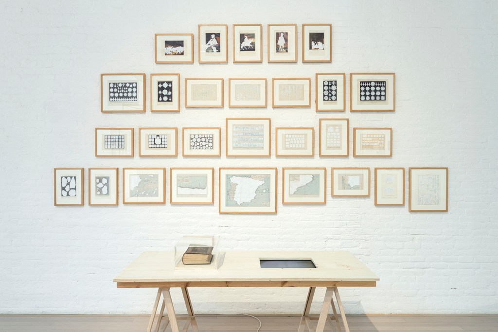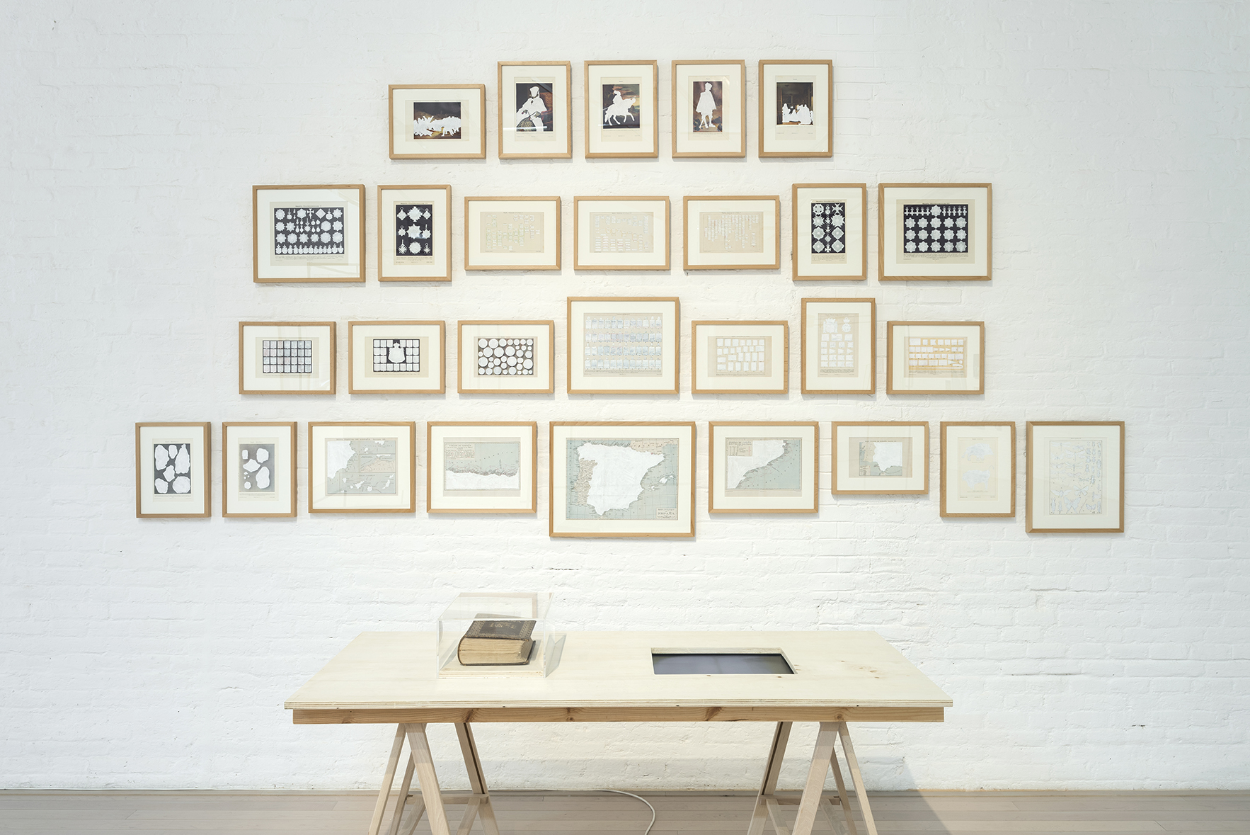Acto I – Manipulación: la ilusión que consuma el engaño. Primero sucede el pase de magia, la trampa, esa mentira con apariencia de verdad, aquello que nos confunde, lo que provoca nuestro error, nuestro convencimiento de hallarnos en una realidad que no es cierta. Hace tiempo que vivimos sometidos al espejismo y a la especulación, atrapados por el cristal negro de nuestras pantallas, por la jaula de las expectativas insatisfechas y de esos deseos convertidos en necesidades a base de falsas promesas. Es entonces cuando ocurre algo, en ocasiones sutil y en otras incuestionable, un hecho que altera nuestra percepción sobre aquello que nos rodea, que deja en evidencia el truco del hechicero que nos hipnotizaba, la maquinación, el contubernio de los poderosos, el complot que mantenía a Truman atrapado en la ficción de su propio show. Es en ese preciso instante cuando nos avergonzamos de no haber visto la confabulación flagrante, cuando nos abochornamos de ser tan crédulos, tan idiotas, tan estúpidos. En “Castles Made of Sand” (2017) Avelino Sala habla de dos cuestiones evidentes, por un lado de la gran farsa que es la política, por el otro de la especulación inmobiliaria y del engaño. Un mago maneja una baraja bañada en oro y confunde al espectador con sus trucos, con el movimiento experto de sus dedos, un público deslumbrado por el brillo reluciente de las cartas. El artista crea un paralelismo entre la treta política, los recursos del especulador y las artimañas de un hábil tahúr. La audiencia le contempla dejándose engañar, el oro (real) de la baraja les ciega, no les permite ver que todo aquello está vacío, a punto de desmoronarse, como un castillo de arena, de naipes. Para “1935. Tabula rasa. Un atlas Mnemosyne diferente” (2017), Sala interviene un libro de la Historia de España publicado en 1935 por la editorial Espasa-Calpe, impreso en los estertores de la II República y antes del inicio de la Guerra Civil, una acción que consiste en el tachado con Tipp-Ex de todo el volumen, página a página, palabra por palabra, imagen a imagen. Una ocultación fascista de la historia anterior a 1936 que continúa vigente con hechos tan frontales como la negación y la manipulación de la memoria histórica. Aquí, el atlas del conocimiento de la civilización europea de Aby Warburg, transmuta en una enciclopedia del olvido de nuestra historia reciente.
