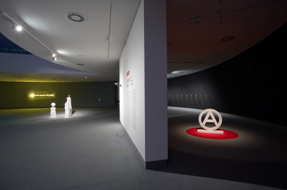 El proyecto “The Global Symbol” de Avelino Sala, debe verse como una gran metáfora del momento en el que nos hallamos, una exposición que toma la forma de un enorme site-specific ubicado en las entrañas de la cúpula que ideó Niemeyer para esta ciudad asturiana. El anti-icono dentro del icono, el anti-símbolo dentro del símbolo, la resistencia y el contraataque dentro del búnker.[5] El artista vuelve a aprovechar las fisuras de una estructura de aspecto pétreo, para infiltrarse y hacer palanca, mientras que las piezas que componen esta propuesta se incorporan a la sobrecogedora arquitectura que las recibe, dejando en evidencia las fallas del sistema que generó, entre otras cosas, todas estas construcciones para la cultura que tanto nos está costando dotar. Avelino Sala (como el filósofo enmascarado) avanza ocultándose con la voluntad de introducirse y detonar lo establecido, de activar el cambio desde la demolición de lo inútil, remarcando lo perverso y lo estúpido de una estructura sociopolítica y económica que, en lugar de habilitarnos, nos oprime y nos corrompe.[6] La media esfera que da forma a esta cúpula (con la polivalencia que Niemeyer siempre deseó) asume en esta exposición el resplandor obnubilante de ese símbolo global que lleva tiempo cegándonos, unas formas sencillas y curvas que componen la figura reconocible de un signo en el que muchos vieron la cuadratura del círculo del estado del bienestar, la red de conexiones de la que casi todos éramos parte y que nos estaba haciendo prosperar: un mundo lleno de posibilidades que era la llave para vivir mejor que nunca. Pero esa red estaba construida con un material que es noble solo en apariencia, la corrupción del sistema ha ido revelando la esencia que subyacía, aquella que deja claro que las cosas no son tan sencillas, aquella que surge de su mal uso, del abuso, de la podredumbre, del exceso y de la desmesura. La red esférica del símbolo global ha terminado siendo una trampa de escala mundial, una jaula dorada que encierra el colapso y la miseria en su interior, de nuevo el búnker casi impenetrable,[7] una cárcel cuyos barrotes toman la forma de amplias autopistas por las que solo transitan con libertad los vehículos (de alta gama) de una elite dirigente que sigue manipulándonos, controlándonos y enriqueciéndose.