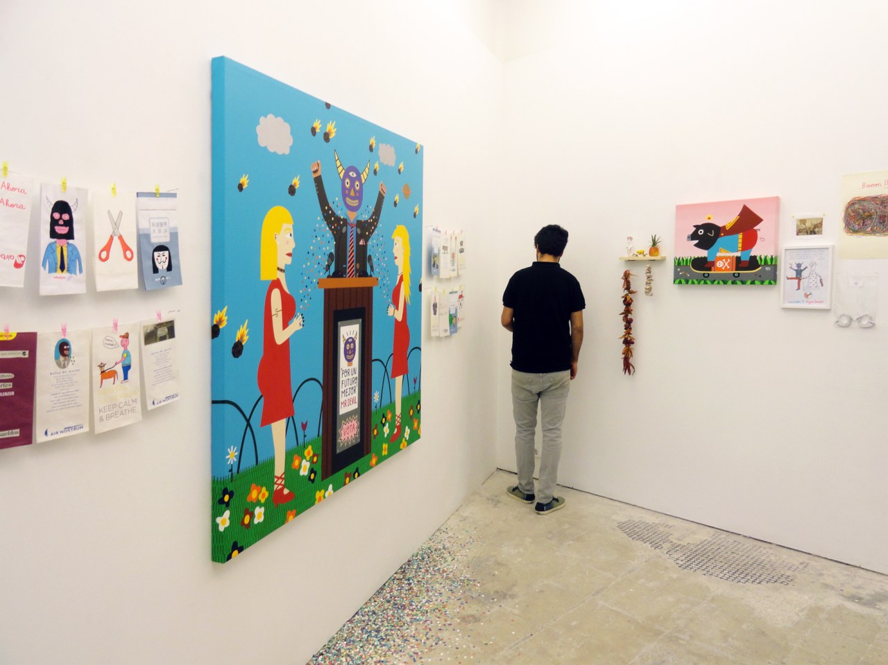 La náusea como reacción, el vómito como efecto. Los nuevos héroes contemporáneos buscan la verdad y sobreviven a la opresión, a lo tendencioso, a lo efímero, a lo que es producto de las modas. Unos héroes que no son tan nuevos, son superhéroes ancestrales tan viejos como el porc negre, como un siurell vengador armado con pebres de cirereta, como cantantes folk que sólo tocan en los pueblos y para el pueblo, como Señor Chinarro y su arenga a los sindicatos futuristas, que mezclan el odio y las vanguardias, la ética y la estética, la V de vendetta y su careta, la manifestación y un cóctel-molotov hecho con destilados de cereales, enebro y quinina, mezclado, removido, no agitado. Hay que estar más unidos que nunca, es la hora de bailar en un espacio minúsculo y, en sitios tan pequeños, sólo se puede bailar juntos, juntos y firmes sobre la pista, juntos y firmes dentro de la galería, de la galería de arte, de la Galería Alegría: una galería de guerrilla, de resistencia, de alegrías.