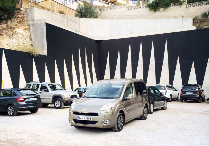 PSJM – «Matriculaciones de turismos en España de 1990 a 2013» Con esta intervención el colectivo PSJM insiste en el desarrollo de un lenguaje propio dentro del campo de la abstracción, una línea que han dado en llamar «geometría social» en la que, a partir de datos estadísticos, se generan composiciones geométricas de gran intensidad. Se trata, por tanto, de pinturas que se leen. El título de la obra dota a la abstracción de un contenido crítico que pervierte la misma tradición de la pintura formalista. Como ya hicieran en “Spanische Malerei” [Pintura española], este colectivo de españoles residentes en Berlín nos presenta un retrato pictórico de la realidad española en clave geométrica. El mural “Matriculaciones de turismos en España de 1990 a 2013” supone una extensión de esta investigación plástica y conceptual. El tema que aborda la pieza surge de la función social que ostenta el espacio público en el que va a ser ubicada: un parking. El número de ventas de turismos suele utilizarse como indicador de la economía de un país, por tanto, el mural viene a mostrar la complicada situación económica y social que estamos sufriendo. Se trata, en suma, de una pintura histórica, un testimonio mural de la época que nos ha tocado vivir . De algún modo, la obra juega al engaño, pues a primera vista aparenta ser simple decoración. Su «verdad» permanece encriptada, y tan sólo será conocida por aquél que se tome la molestia de leer la placa gravada con el título y el autor de la obra que se colocará al lado del mural. Presumiblemente, esta verdad oculta será popularizada por el rumor. Un hecho que mantendrá la obra viva y siempre «dará que hablar» a la población y visitantes de Calvià.