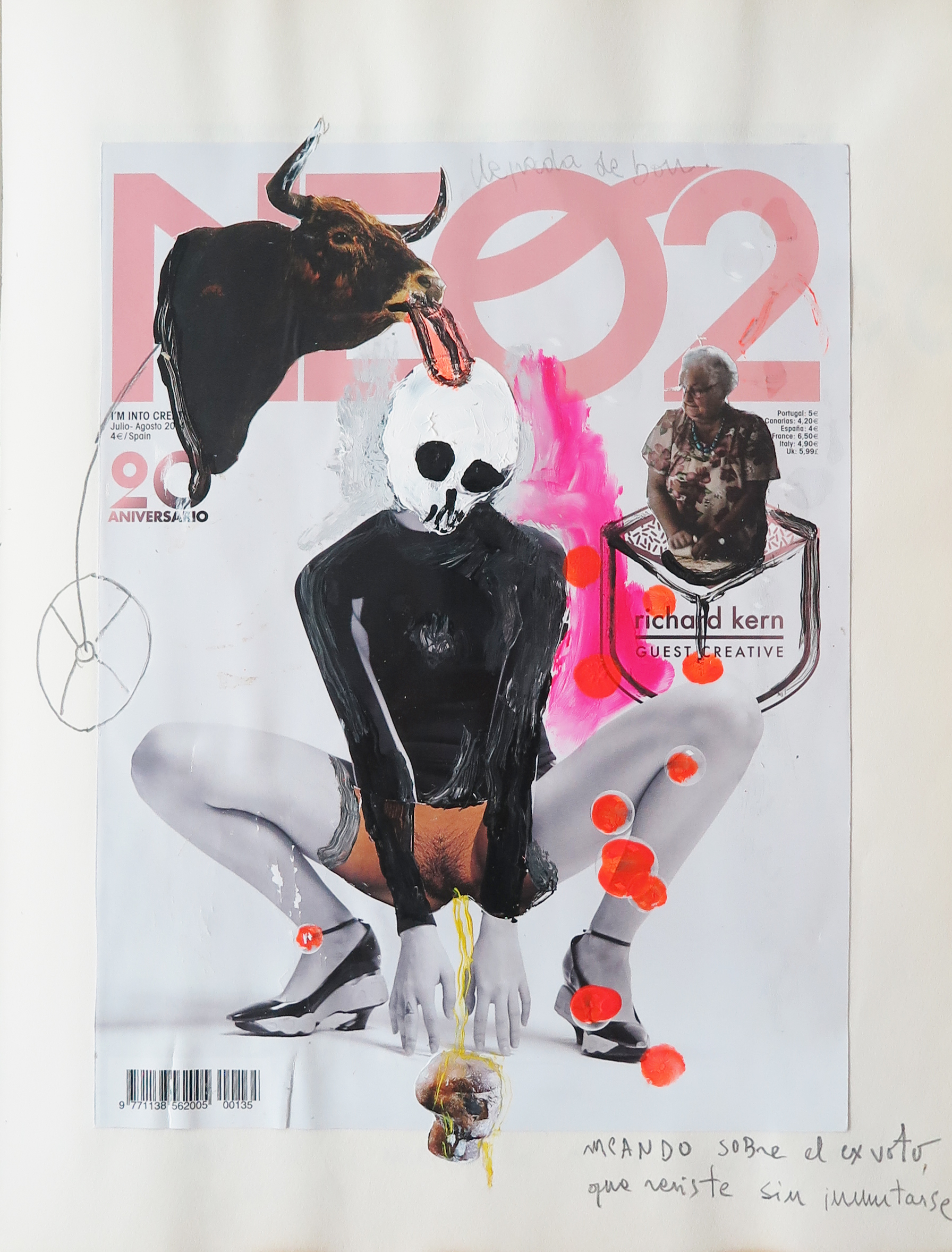 Las series con las que Planas participa en “Salvajes” dejan en evidencia todos esos intereses que concentra el autor, una sensibilidad que, al igual que les ocurriera a aquellas fieras enjauladas de principios del XX, converge con el arte primitivo, en especial con el africano, con el sexo, con la desmesura, con los tabús, con la violencia y con la muerte, con la religión y contra la iglesia, contra la enseñanza represiva, y lo hace con un anti-clasicismo que se refiere permanentemente a lo clásico, a la vez que huye de lo inocuo y de la indolencia. Un artista que llena sus piezas de pasión, de lucha, de posicionamiento y de vehemencia, demostrando un apetito insaciable y una inteligencia clarividente que procesa y depura lo engullido para plasmarlo en una obra que no da tregua. Su gusto por lo abyecto, por lo desagradable, es equiparable a su incansable búsqueda estética, transitando esos terrenos fronterizos donde la belleza se define por contacto, simbiosis y colisión con lo siniestro. Es por ello que en muchas de sus piezas incluye el cráneo como icono, como símbolo, pero también como concepto, como una vanitas que actúa casi como una firma y que nos recuerda la vacuidad de la vida. Planas mantiene una investigación recurrente sobre lo inadecuado, donde imágenes de sexo explícito se alternan con escenas violentas, donde comparecen sotanas, biblias, fetos, implantes mamarios y otros dispositivos quirúrgicos, que nos hablan de los sacrificios de la mujer y de los abusos a la infancia. Sin embargo, Planas, siempre dice que su intención primera no es la de la denuncia social ni un posicionamiento político, sino que, más bien, responde a una necesidad personal de exorcizar sus demonios, de sacar sus fantasmas y de sanar sus miedos, una catarsis necesaria que da salida a una incontenible y salvaje pulsión interna.