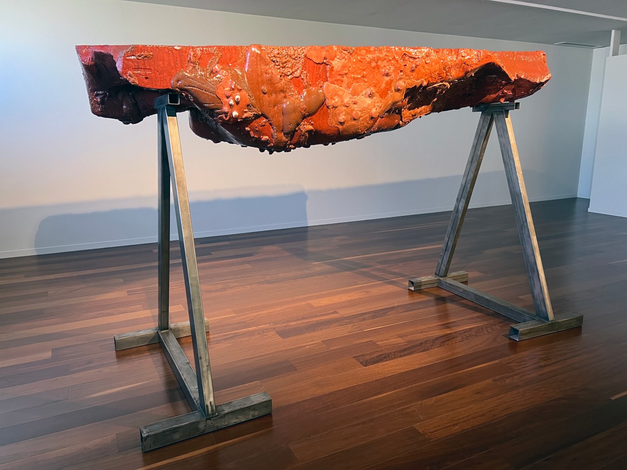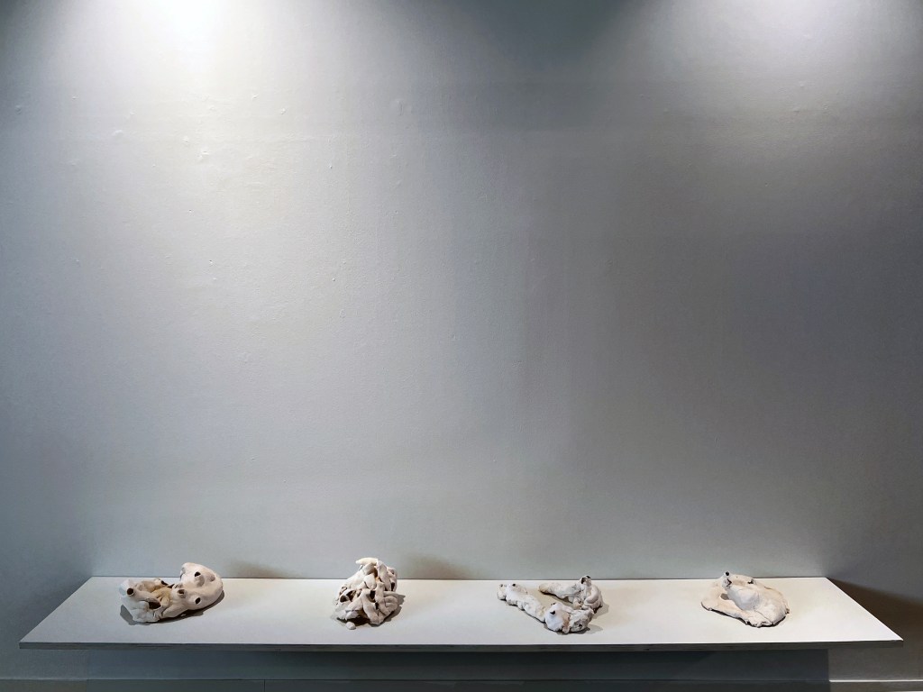 Carne es una maravillosa metáfora de cómo Amparo Sard concibe el acto de crear. Carne es un desvelamiento osado, un gesto extraordinario con el que la artista traslada a la sala de exposiciones los elementos orgánicos, cavernosos, bellos, siniestros y casi vivos que toman forma en su taller, en ese lugar íntimo y oculto donde se produce el hecho sublime de la creación. Esculturas, pinturas, dibujos, vídeo y una gran pieza instalativa recogen todos esos organismos extraños que son y que contienen materia, que supuran y ofrecen esas entrañas de las que la artista se nutre, se alimenta y nos alimenta. Concavidades y vísceras, instrumentos inexplicables, mesas de producción pero también de despiece, de disección, perchas metálicas y estructuras inquietantes, masas que son penetradas por las manos de la artista mientras agranda los orificios con sus dedos, mientras mete sus extremidades en el interior para provocar ese desmembramiento que convertirá sus despojos en alimento, en pedazos de carne propia que compartirá con todos aquellos que deseen engullirlos. La artista se autorrepresenta trepanada, despellejada y descuartizada, con sus intestinos y su piel separados de la carcasa hueca, como si de ella no quedara más que un abismo segregado de su propia materia, mostrando la carne que hay debajo de la apariencia, enseñándonos aquellas tripas, aquella obra que, en un acto de verdadera y generosa creación, nos ha sido ofrecida para ser revelada y devorada.