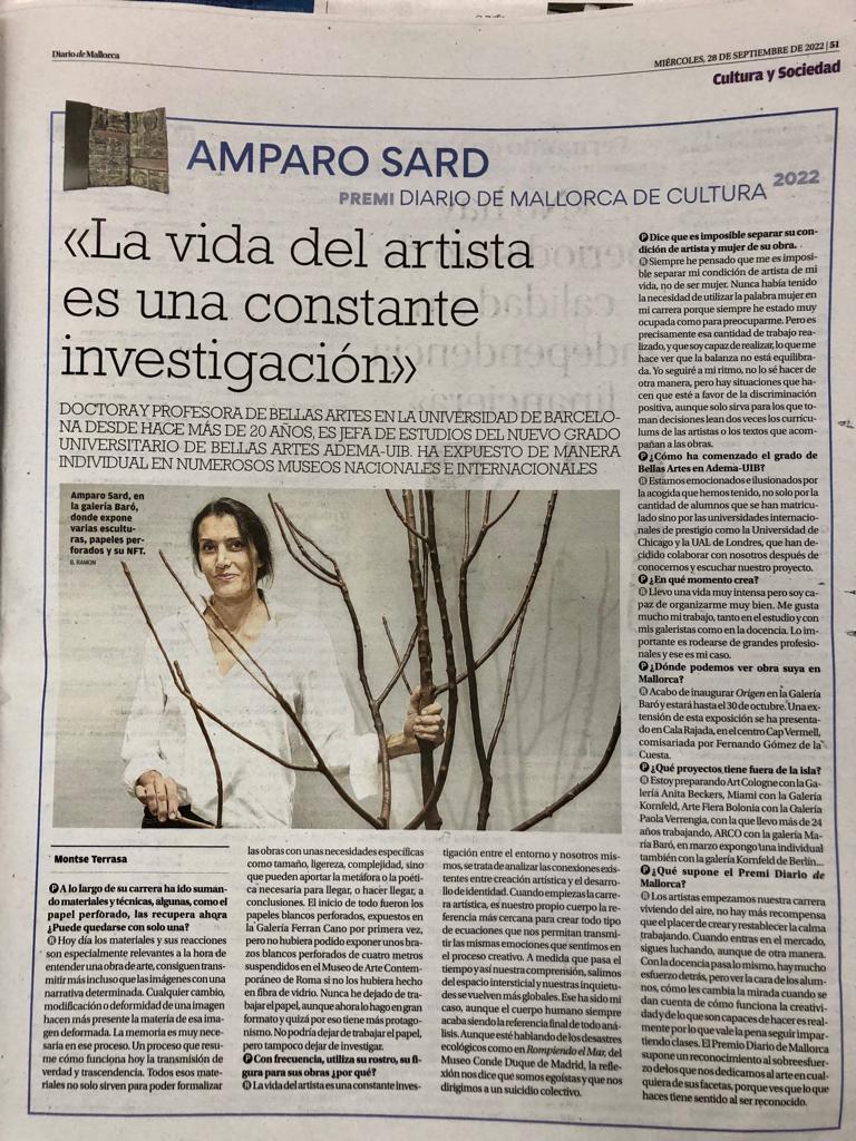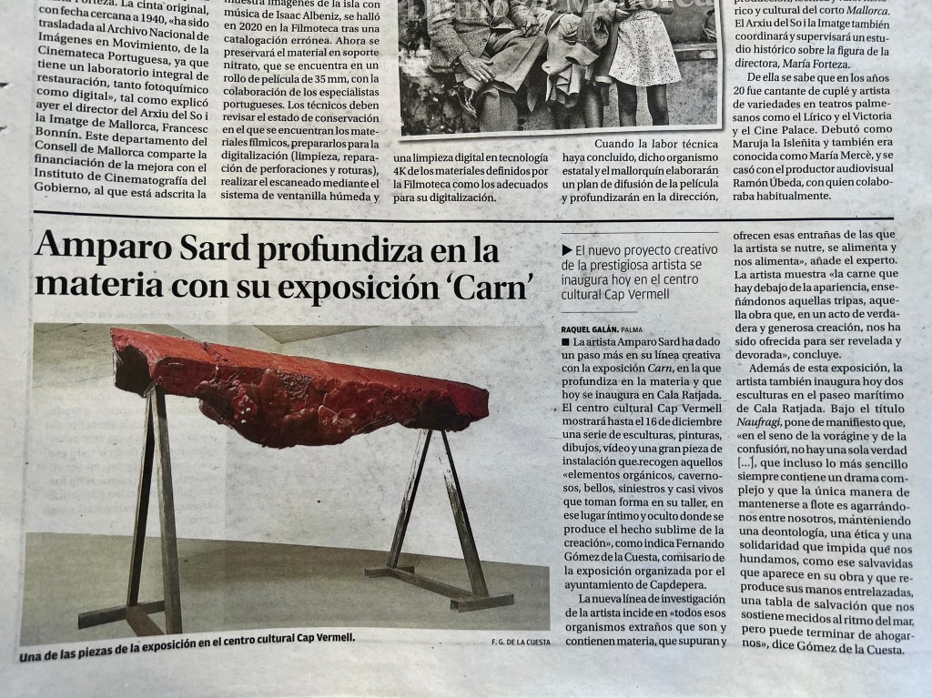 Carn és una meravellosa metàfora de com Amparo Sard concep l’acte de crear. Carn és un desvetllament agosarat, un gest extraordinari amb què l’artista trasllada a la sala d’exposicions els elements orgànics, cavernosos, bells, sinistres i gairebé vius que prenen forma al seu taller, en aquest lloc íntim i ocult on es produeix el fet sublim de la creació. Escultures, pintures, dibuixos, vídeo i una gran peça instal·lativa recullen tots aquests organismes estranys que són i que contenen matèria, que supuren i ofereixen aquestes entranyes de les quals l’artista es nodreix, s’alimenta i ens alimenta. Concavitats i vísceres, instruments inexplicables, taules de producció però també d’escorxament, de dissecció, penjadors metàl·lics i estructures inquietants, masses que són penetrades per les mans de l’artista mentre fa grans els orificis amb els dits, mentre fica les extremitats a l’interior per provocar aquest desmembrament que convertirà les seves despulles en aliment, en trossos de carn pròpia que compartirà amb tots aquells que vulguin engolir-los. L’artista s’autorepresenta trepanada, especejada i esquarterada, amb els seus intestins i la seva pell separats de la carcassa buida, com si no en quedés res més que un abisme segregat de la seva pròpia matèria, mostrant la carn que hi ha sota l’aparença, ensenyant-nos aquells budells, aquella obra que, en un acte de veritable i generosa creació, ens ha estat oferta per ser revelada i devorada.